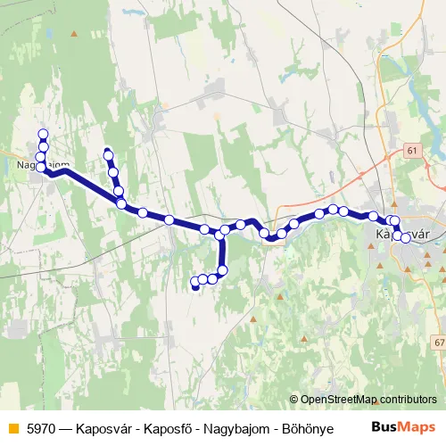 The first stop of the 5970 bus route is Nagybajom, Kunmajor and the last stop is Kaposvár, autóbusz-állomás. 5970 (Kaposvár - Kaposfő - Nagybajom - Böhönye) is operational during everyday.