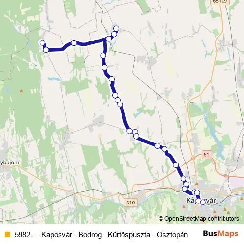 The first stop of the 5982 bus route is Osztopán, Iskola and the last stop is Kaposvár, autóbusz-állomás. 5982 (Kaposvár - Bodrog - Kürtöspuszta - Osztopán) is operational during on weekdays.