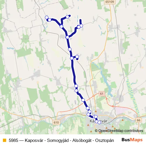 The first stop of the 5985 bus route is Osztopán, Felső and the last stop is Kaposvár, autóbusz-állomás. 5985 (Kaposvár - Somogyjád - Alsóbogát - Osztopán) is operational during everyday.