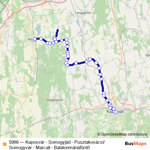 The first stop of the 5986 bus route is Marcali, autóbusz-állomás and the last stop is Kaposvár, autóbusz-állomás. 5986 (Kaposvár - Somogyjád - Pusztakovácsi/Somogyvár - Marcali - Balatonmáriafürdő) is operational during everyday.