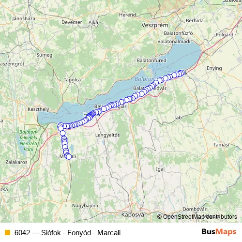 The first stop of the 6042 bus route is Siófok, autóbusz-állomás and the last stop is Marcali, autóbusz-állomás. 6042 (Siófok - Fonyód - Marcali) is operational during everyday.