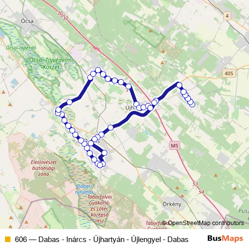 The first stop of the 606 bus route is Dabas, Gyón tatárszentgyörgyi elágazás and the last stop is Dabas, Gyón tatárszentgyörgyi elágazás. 606 (Dabas - Inárcs - Újhartyán - Újlengyel - Dabas) is operational during on weekends.