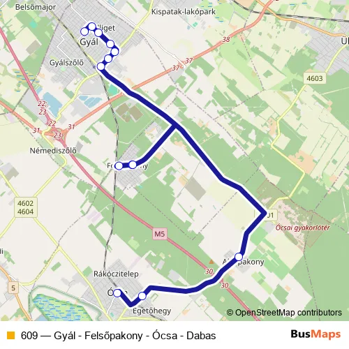 The first stop of the 609 bus route is Gyál, Rákóczi utca and the last stop is Ócsa, vasútállomás. 609 (Gyál - Felsőpakony - Ócsa - Dabas) is operational during on weekdays.