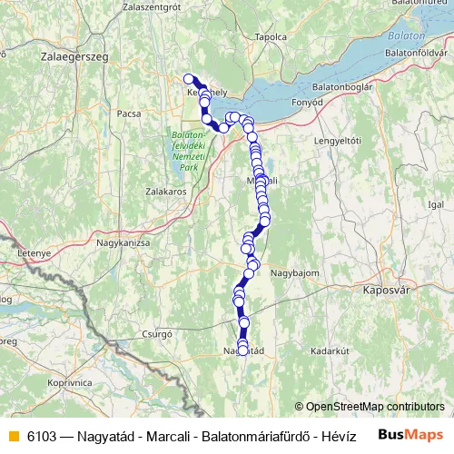 The first stop of the 6103 bus route is Balatonmáriafürdő, vasútállomás and the last stop is Nagyatád, autóbusz-állomás. 6103 (Nagyatád - Marcali - Balatonmáriafürdő - Hévíz) is operational during everyday.