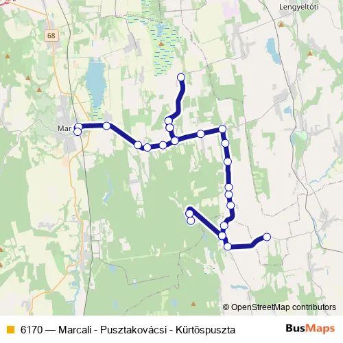 The first stop of the 6170 bus route is Pusztakovácsi, Kürtöspuszta and the last stop is Marcali, autóbusz-állomás. 6170 (Marcali - Pusztakovácsi - Kürtöspuszta) is operational during everyday.