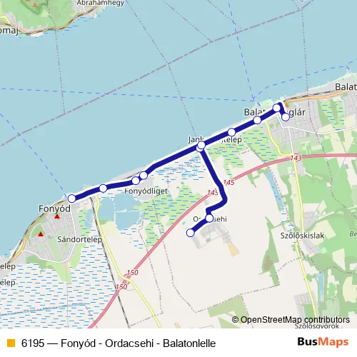 The first stop of the 6195 bus route is Ordacsehi, Szabadság tér and the last stop is Balatonboglár, vasútállomás. 6195 (Fonyód - Ordacsehi - Balatonlelle) is operational during everyday.