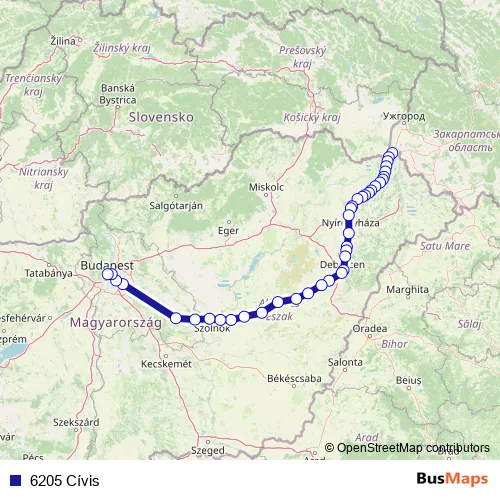 The first stop of the 6205 Cívis rail route is Záhony and the last stop is Budapest-Nyugati. 6205 Cívis is operational during everyday.