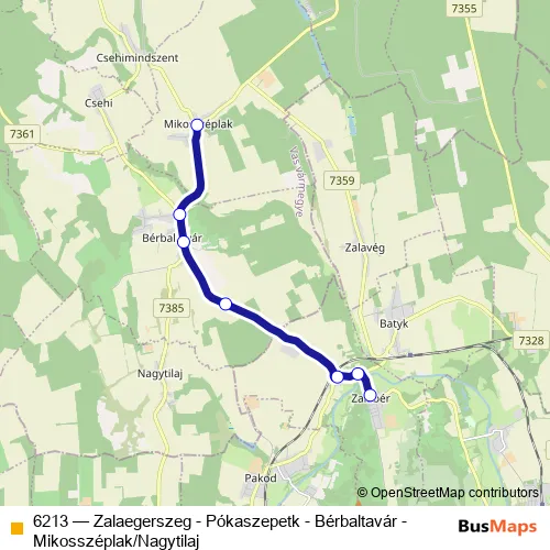 The first stop of the 6213 bus route is Mikosszéplak, autóbusz-forduló and the last stop is Zalabér, autóbusz-váróterem. 6213 (Zalaegerszeg - Pókaszepetk - Bérbaltavár - Mikosszéplak/Nagytilaj) is operational during on weekdays.