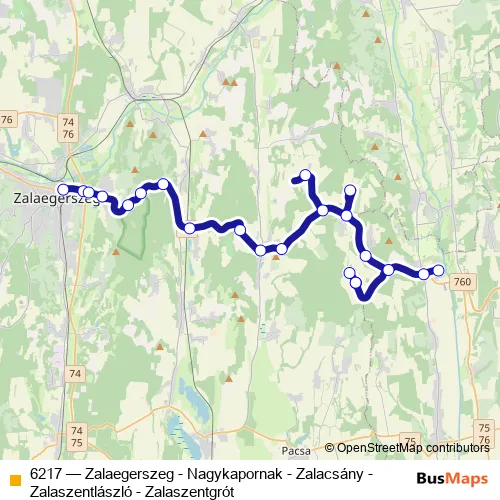 The first stop of the 6217 bus route is Zalaegerszeg, autóbusz-állomás and the last stop is Zalacsány, kultúrotthon. 6217 (Zalaegerszeg - Nagykapornak - Zalacsány - Zalaszentlászló - Zalaszentgrót) is operational during everyday.