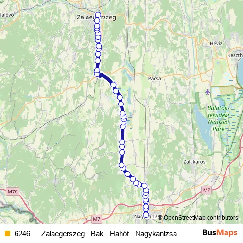 The first stop of the 6246 bus route is Nagykanizsa, autóbusz-állomás and the last stop is Zalaegerszeg, autóbusz-állomás. 6246 (Zalaegerszeg - Bak - Hahót - Nagykanizsa) is operational during everyday.