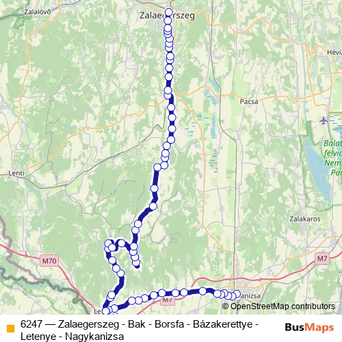 The first stop of the 6247 bus route is Nagykanizsa, autóbusz-állomás and the last stop is Zalaegerszeg, autóbusz-állomás. 6247 (Zalaegerszeg - Bak - Borsfa - Bázakerettye - Letenye - Nagykanizsa) is operational during on weekdays.