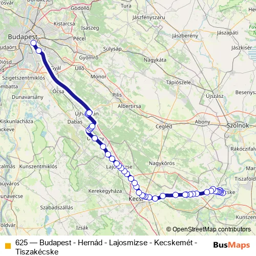 The first stop of the 625 bus route is Tiszakécske, Templom tér and the last stop is Budapest, Népliget autóbusz-pályaudvar. 625 (Budapest - Hernád - Lajosmizse - Kecskemét - Tiszakécske) is operational during everyday.