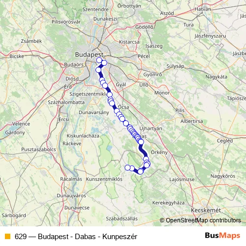 The first stop of the 629 bus route is Budapest, Népliget autóbusz-pályaudvar and the last stop is Kunpeszér, Középpeszér. 629 (Budapest - Dabas - Kunpeszér) is operational during everyday.