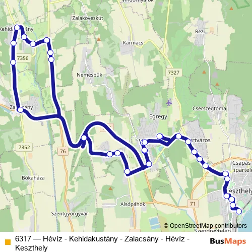 The first stop of the 6317 bus route is Hévíz, autóbusz-állomás and the last stop is Keszthely, autóbusz-állomás. 6317 (Hévíz - Kehidakustány - Zalacsány - Hévíz - Keszthely) is operational during on weekdays.