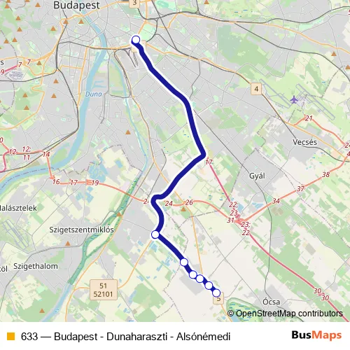 The first stop of the 633 bus route is Budapest, Népliget autóbusz-pályaudvar and the last stop is Alsónémedi, Ócsai elágazás. 633 (Budapest - Dunaharaszti - Alsónémedi) is operational during on weekdays.