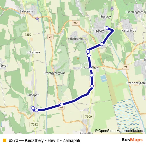 The first stop of the 6370 bus route is Keszthely, autóbusz-állomás and the last stop is Szentgyörgyvár, autóbusz-forduló. 6370 (Keszthely - Hévíz - Zalaapáti) is operational during everyday.