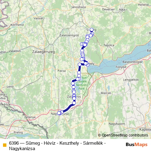 The first stop of the 6396 bus route is Sümeg, autóbusz-állomás and the last stop is Nagykanizsa, autóbusz-állomás. 6396 (Sümeg - Hévíz - Keszthely - Sármellék - Nagykanizsa) is operational during everyday.