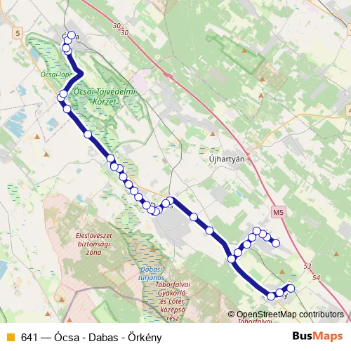 The first stop of the 641 bus route is Örkény, vasútállomás and the last stop is Ócsa, vasútállomás. 641 (Ócsa - Dabas - Örkény) is operational during on weekdays.