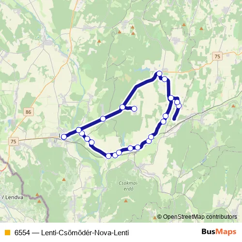 The first stop of the 6554 bus route is Lenti, autóbusz-állomás and the last stop is Lenti, autóbusz-állomás. 6554 (Lenti-Csömödér-Nova-Lenti) is operational during on weekends.