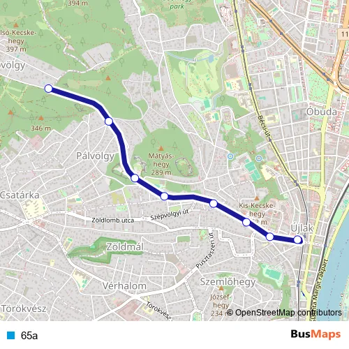 The first stop of the 65a bus route is Fenyőgyöngye and the last stop is Kolosy tér. 65a is operational during everyday.