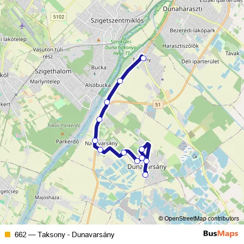 The first stop of the 662 bus route is Taksony, Baross tér and the last stop is Dunavarsány, vasútállomás. 662 (Taksony - Dunavarsány) is operational during on weekdays.