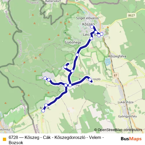 The first stop of the 6728 bus route is Kőszeg, autóbusz-állomás and the last stop is Bozsok, autóbusz-váróterem. 6728 (Kőszeg - Cák - Kőszegdoroszló - Velem - Bozsok) is operational during everyday.