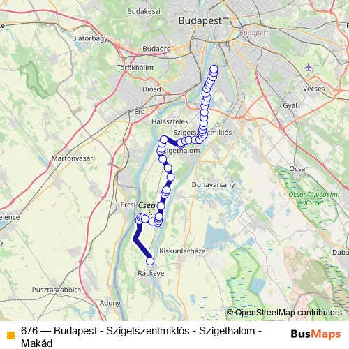 The first stop of the 676 bus route is Ráckeve, HÉV-állomás and the last stop is Budapest, Vermes Miklós utca. 676 (Budapest - Szigetszentmiklós - Szigethalom - Makád) is operational during everyday.