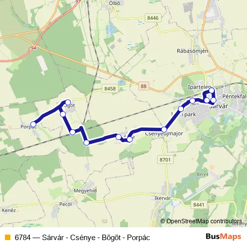 The first stop of the 6784 bus route is Sárvár, autóbusz-állomás and the last stop is Porpác, faluvég. 6784 (Sárvár - Csénye - Bögöt - Porpác) is operational during everyday.