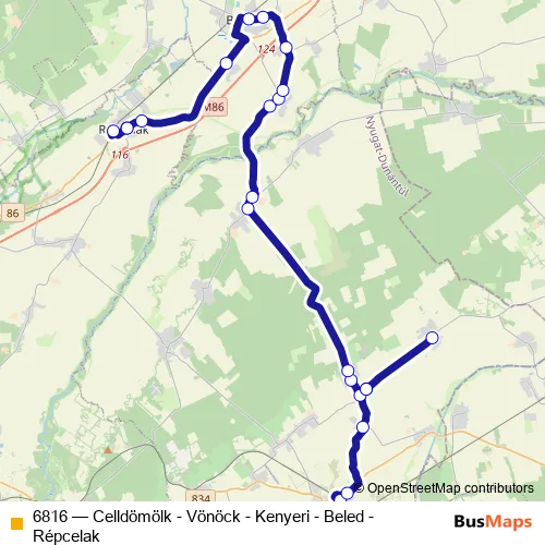 The first stop of the 6816 bus route is Celldömölk, vasútállomás and the last stop is Répcelak, vasútállomás. 6816 (Celldömölk - Vönöck - Kenyeri - Beled - Répcelak) is operational during everyday.