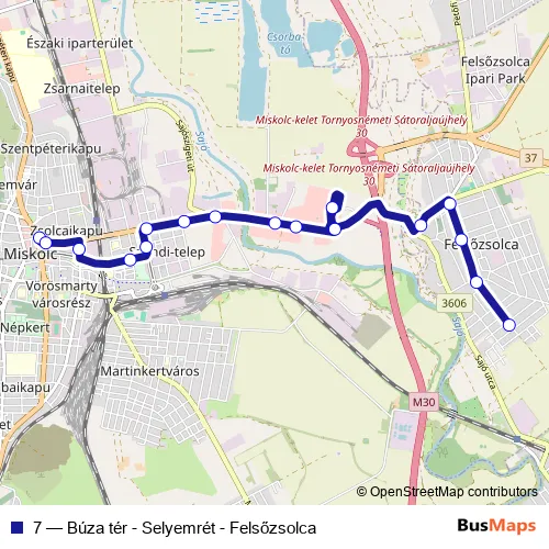 The first stop of the 7 bus route is Búza tér and the last stop is Felsőzsolca. 7 (Búza tér - Selyemrét - Felsőzsolca) is operational during everyday.