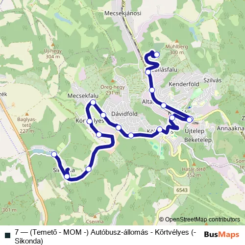 The first stop of the 7 bus route is Komló, Temető and the last stop is Komló (Sikonda), Vadásztanya. 7 ((Temető - MOM -) Autóbusz-állomás - Körtvélyes (- Sikonda)) is operational during everyday.