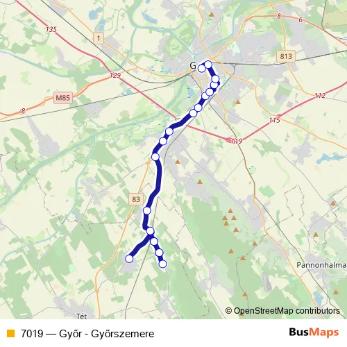 The first stop of the 7019 bus route is Győrszemere, központ and the last stop is Győr, autóbusz-állomás. 7019 (Győr - Győrszemere) is operational during on weekdays.