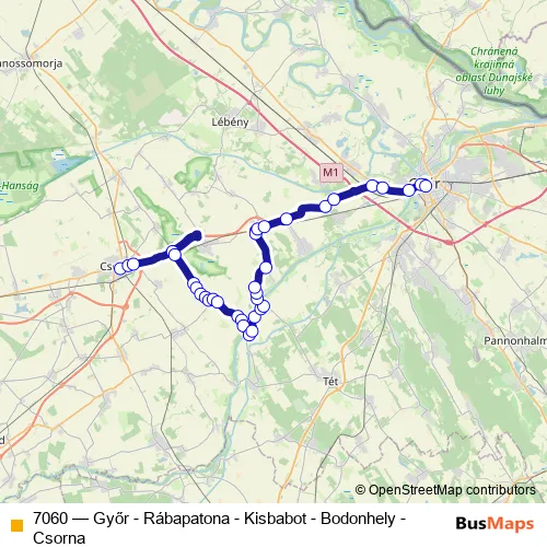 The first stop of the 7060 bus route is Csorna, autóbusz-állomás and the last stop is Győr, autóbusz-állomás. 7060 (Győr - Rábapatona - Kisbabot - Bodonhely - Csorna) is operational during everyday.