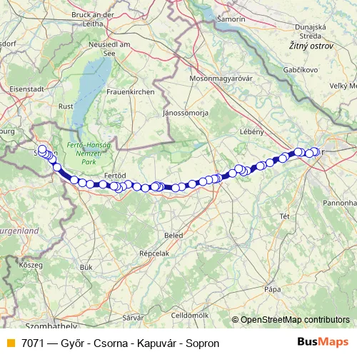 The first stop of the 7071 bus route is Győr, autóbusz-állomás and the last stop is Sopron, autóbusz-állomás. 7071 (Győr - Csorna - Kapuvár - Sopron) is operational during everyday.