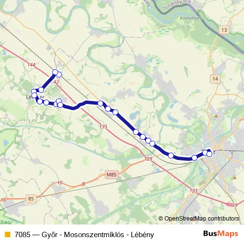 The first stop of the 7085 bus route is Lébény-Mosonszentmiklós, vasútállomás and the last stop is Győr, autóbusz-állomás. 7085 (Győr - Mosonszentmiklós - Lébény) is operational during everyday.