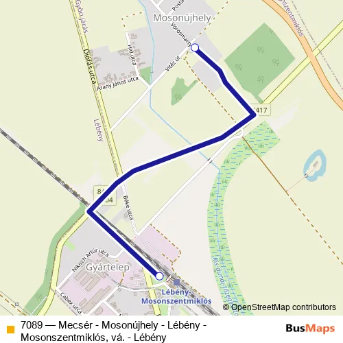 The first stop of the 7089 bus route is Mosonszentmiklós, Mosonújhely forduló and the last stop is Lébény-Mosonszentmiklós, vasútállomás. 7089 (Mecsér - Mosonújhely - Lébény - Mosonszentmiklós, vá. - Lébény) is operational during on weekdays.