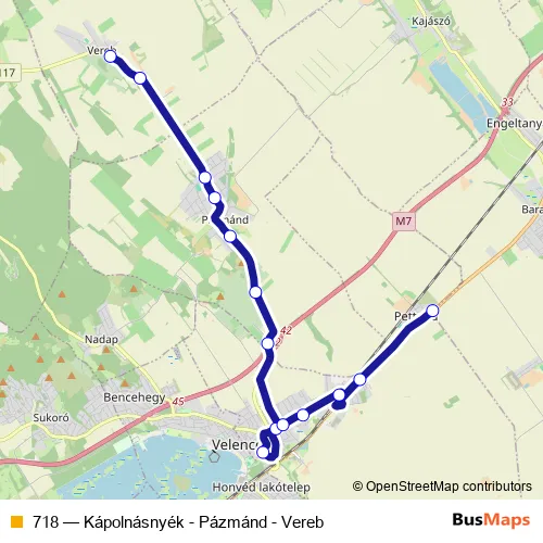 The first stop of the 718 bus route is Vereb, Szabadság tér and the last stop is Kápolnásnyék, Pettend. 718 (Kápolnásnyék - Pázmánd - Vereb) is operational during everyday.