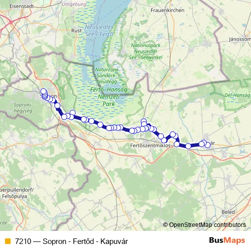 The first stop of the 7210 bus route is Kapuvár, autóbusz-állomás and the last stop is Sopron, autóbusz-állomás. 7210 (Sopron - Fertőd - Kapuvár) is operational during everyday.