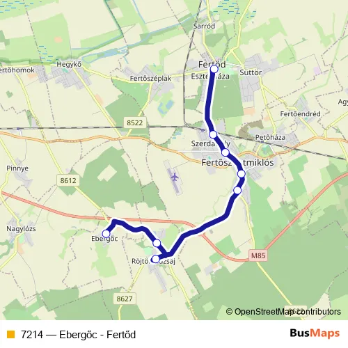 The first stop of the 7214 bus route is Fertőd, Központ and the last stop is Ebergőc, autóbusz-forduló. 7214 (Ebergőc - Fertőd) is operational during on weekdays.