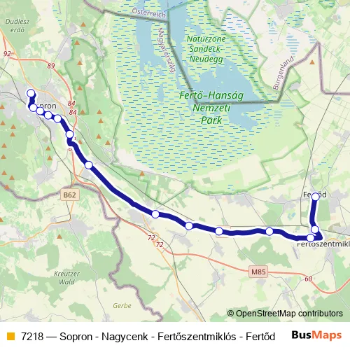 The first stop of the 7218 bus route is Sopron, autóbusz-állomás and the last stop is Fertőd, Központ. 7218 (Sopron - Nagycenk - Fertőszentmiklós - Fertőd) is operational during on weekdays.