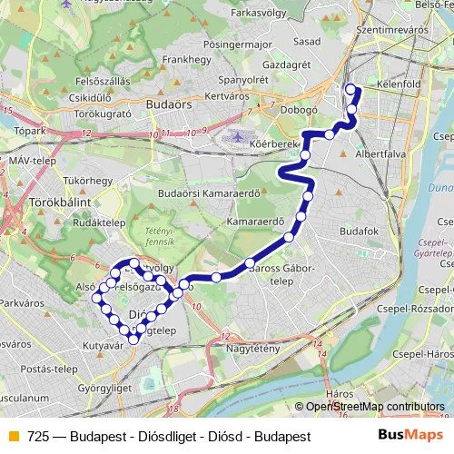 The first stop of the 725 bus route is Budapest, Kelenföld vasútállomás and the last stop is Budapest, Kelenföld vasútállomás. 725 (Budapest - Diósdliget - Diósd - Budapest) is operational during on weekdays.