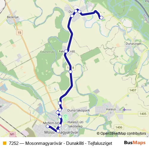 The first stop of the 7252 bus route is Dunakiliti (Tejfalusziget), vegyesbolt and the last stop is Mosonmagyaróvár, autóbusz-végállomás. 7252 (Mosonmagyaróvár - Dunakiliti - Tejfalusziget) is operational during on weekdays.