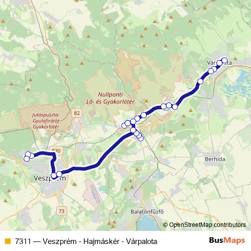 The first stop of the 7311 bus route is Várpalota, autóbusz-állomás and the last stop is Veszprém, Piramis utca. 7311 (Veszprém - Hajmáskér - Várpalota) is operational during everyday.