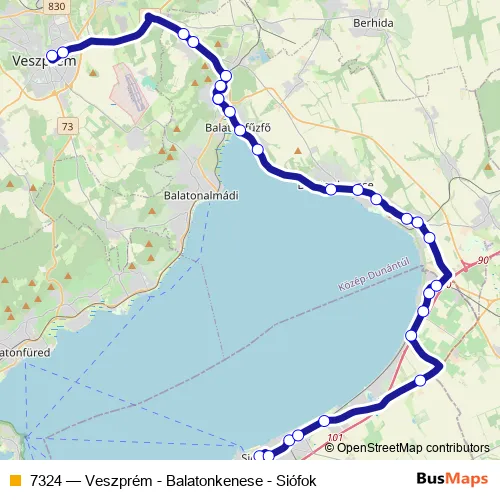 The first stop of the 7324 bus route is Siófok, autóbusz-állomás and the last stop is Veszprém, autóbusz-állomás. 7324 (Veszprém - Balatonkenese - Siófok) is operational during everyday.