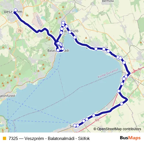 The first stop of the 7325 bus route is Veszprém, autóbusz-állomás and the last stop is Siófok, autóbusz-állomás. 7325 (Veszprém - Balatonalmádi - Siófok) is operational during everyday.