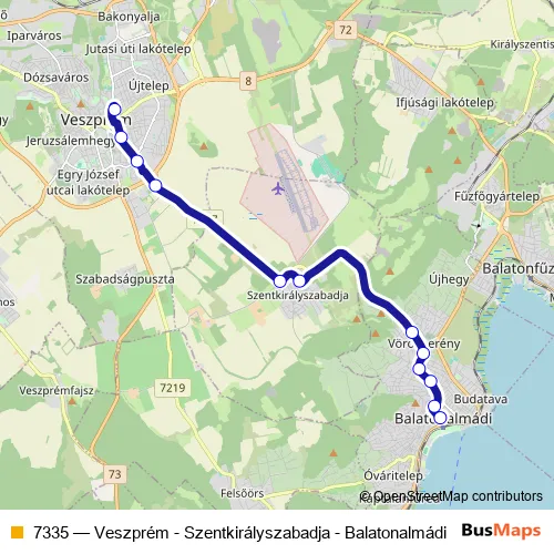 The first stop of the 7335 bus route is Veszprém, autóbusz-állomás and the last stop is Balatonalmádi, autóbusz-állomás. 7335 (Veszprém - Szentkirályszabadja - Balatonalmádi) is operational during everyday.