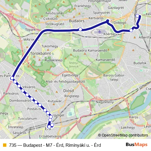 The first stop of the 735 bus route is Budapest, Kelenföld vasútállomás and the last stop is Érd, autóbusz-állomás. 735 (Budapest - M7 - Érd, Riminyáki u. - Érd) is operational during everyday.