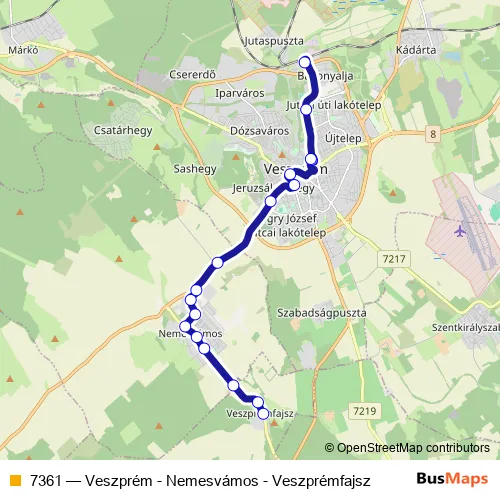 The first stop of the 7361 bus route is Veszprémfajsz, autóbusz-forduló and the last stop is Veszprém, autóbusz-állomás. 7361 (Veszprém - Nemesvámos - Veszprémfajsz) is operational during everyday.