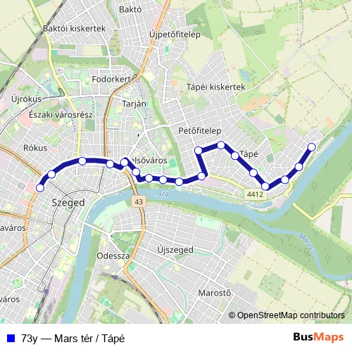 The first stop of the 73y bus route is Mars tér (autóbusz-állomás) and the last stop is Csatár utca. 73y (Mars tér / Tápé) is operational during everyday.