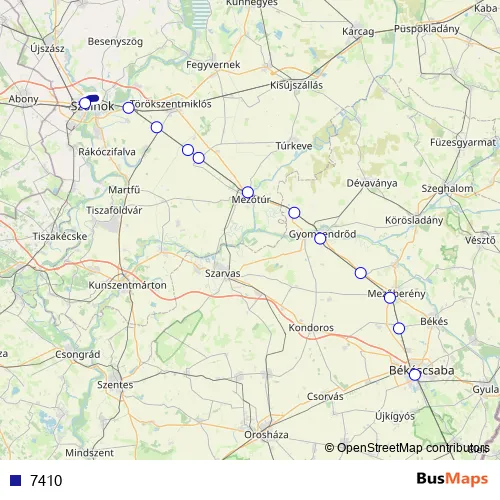 The first stop of the 7410 rail route is Szolnok and the last stop is Békéscsaba. 7410 is operational during everyday.